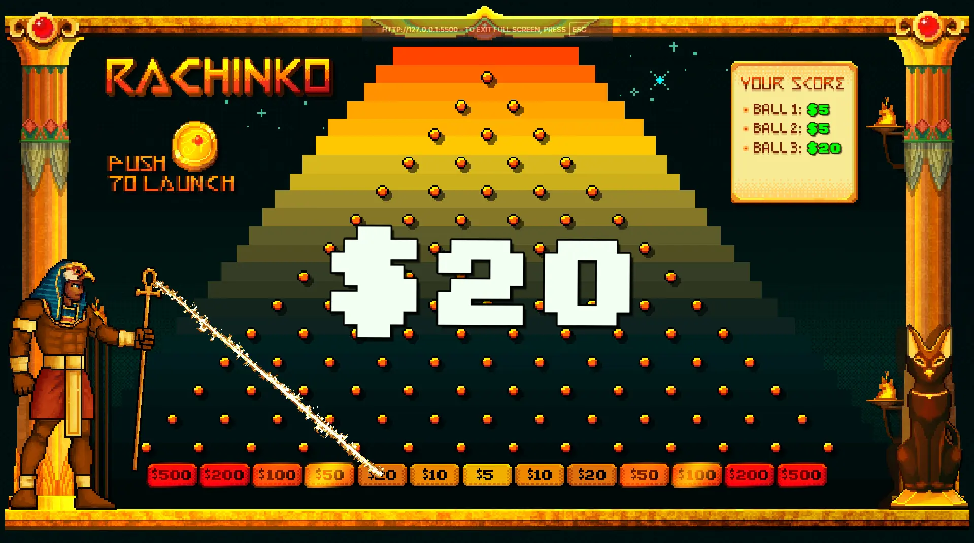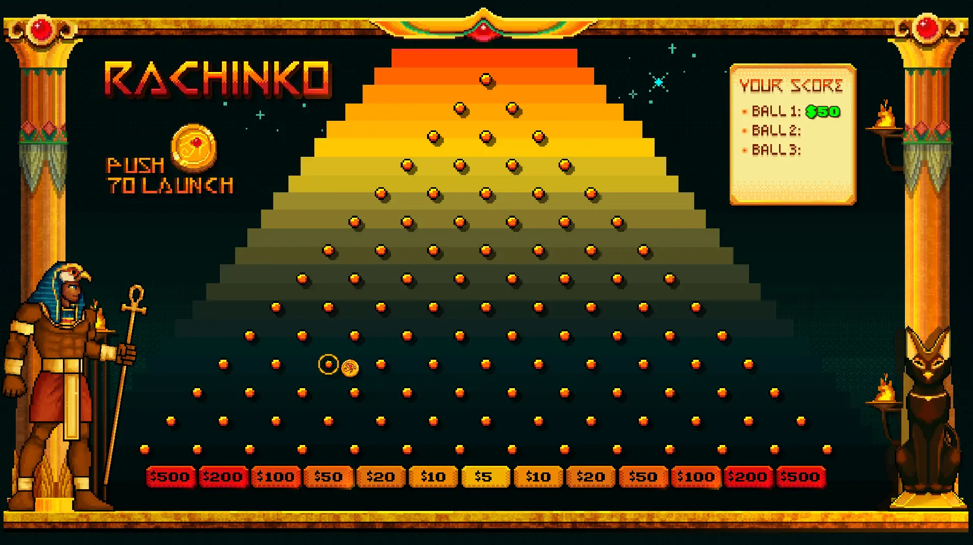 Inspired by classic pachinko mechanics, Rachinko introduces a unique twist — the Egyptian god Ra actively interacts with the board, firing lightning shots that can influence outcomes and trigger exciting moments.